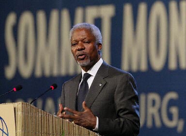 姆貝基、安南、第五十六屆聯(lián)大主席韓升洙先后在開幕式上致辭。安南在講話中呼吁,國際社會特別是發(fā)達國家應該為地球、為未來負起責任。他說,本次會議的重點集中在人類與自然資源的關系上。目前,氣候變化、污染、漁業(yè)資源的損耗等環(huán)境問題已經(jīng)讓人無法視而不見。