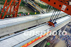 五日,隨著第2550根預(yù)應(yīng)力混凝土軌道梁穩(wěn)穩(wěn)地架設(shè)在磁懸浮工程的蓋梁上,上海磁懸浮工程實(shí)現(xiàn)了軌道梁全線貫通。圖為第2550根軌道梁架設(shè)成功。作者:湯彥俊