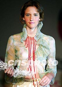 意大利模特五日在青島展示一款薄如蟬翼的透視裝。2002年青島國際時裝周五日開幕,來自中國、意大利、俄羅斯的時裝模特們在T型臺上展示俄羅斯、日本和中國著名時裝設計師的作品。作者:毛建軍