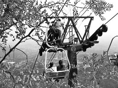 據(jù)了解,昨天中午12時20分左右,為香山公園布置監(jiān)控系統(tǒng)的北京機(jī)械科學(xué)研究院監(jiān)控工作室在布線過程中,因為施工用的鋼纜卡住一輛纜車,造成纜車上一名游客跌落下來受傷,另一名游客吊在空中時被工作人員及時救下。事故發(fā)生在11到12支架之間,一度引起整個索道停運(yùn)。記者在現(xiàn)場看到,事故發(fā)生處的索道鋼纜纏成一團(tuán)亂麻,有工程人員站在鋼纜上將纏住的線剪斷。