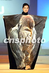 模特在九月青島國際時裝周上展示印有大猩猩圖案的時裝。由日本著名時裝設計師古川云雪設計的環(huán)境時裝,用廢舊塑料飲料瓶生產(chǎn)的布料制作,以號召人們加強環(huán)保意識。作者:毛建軍