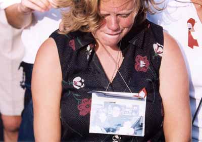 美東時間十一日上午,紐約世貿中心遺址舉行隆重的紀念活動。圖為一位去年“九一一”恐怖襲擊事件中失去丈夫的婦女在紀念活動上自始至終地哭泣。作者:龔文謨