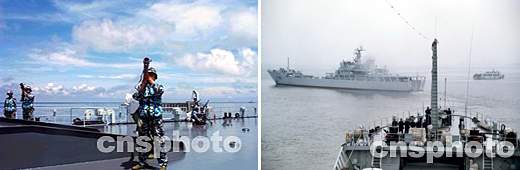 左圖:登陸兵在艦上進(jìn)行防空演練。 右圖:艦艇編隊在航行中演練。