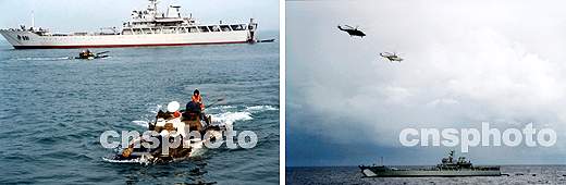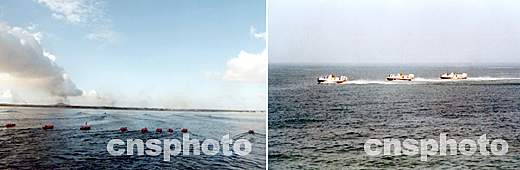 左圖:新型氣墊船沖擊上陸。 右圖:艦艇在海上進(jìn)行隊形變化。