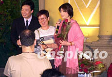 第十六屆澳門國際音樂節(jié)九日晚在澳門玫瑰堂前地舉行“蔡琴、費玉清玫瑰之約”藝術家之約活動,許多蔡琴的歌迷紛紛走上臨時舞臺向她獻上玫瑰花并輿她合影。李剛 攝