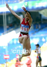 中國選手張灝十三日在釜山綜合體育場舉行的女子三級跳遠中獲銀牌。圖為張灝在比賽中。作者:武仲林
