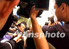 中國體育代表團(tuán)十四日在釜山亞運新聞中心舉行最后的記者招待會。圖為李富榮副團(tuán)長在記者的包圍采訪中。作者:賈國榮