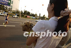 一名韓國小姐懷抱愛犬十四日下午等在釜山街頭,為亞運(yùn)會男子馬拉松賽鼓掌加油。作者:賈國榮