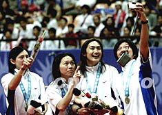 中國臺北女子籃球隊14日在第十四屆亞運會上獲得季軍,運動員在頒獎臺上用數(shù)碼像機留影。作者:趙振清