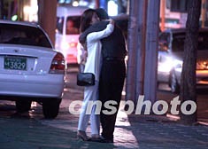 韓國釜山亞運會十四日閉幕之夜,一對年青男女在街頭親密擁抱。作者:賈國榮