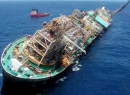 援救人員通過向油箱另一側(cè)注水,使船的狀況得到穩(wěn)定,傾斜度也有所減小。這艘鉆油船是用一艘油輪改裝的,作業(yè)地點在離里約熱內(nèi)盧海岸80公里的海上,日產(chǎn)石油約34000桶。