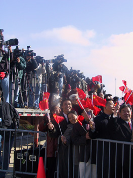 訪問期間,江澤民主席將與布什總統(tǒng)舉行會晤,就雙邊關(guān)系和其他共同關(guān)心的問題深入交換看法。美國和各國駐美新聞機(jī)構(gòu)均對江澤民此次訪問給予極大關(guān)注。圖為江澤民抵達(dá)芝加哥奧海爾國際機(jī)場時記者爭先采訪的現(xiàn)場。