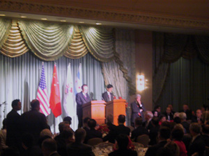 會見后,江澤民和夫人王冶坪出席了瑞恩州長、芝加哥市政府和外交關(guān)系委員會舉行的盛大歡迎晚宴。伊州、芝市各界知名人士四百多人出席了宴會。