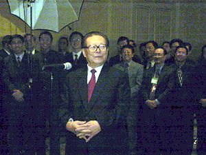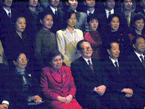 當(dāng)?shù)貢r(shí)間今天晚上八點(diǎn)四十分,正在美國進(jìn)行訪問的中國國家主席江澤民在下榻的飯店會(huì)見了中國駐芝加哥總領(lǐng)館工作人員、留學(xué)生和華僑華人代表,并與大家合影留念。中新社記者 呂振亞 攝