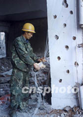 三峽導流明渠截流在即 ,爆破人員在重慶奉節(jié)舊縣城,給要拆除的房子裝彈藥,準備進行一次性爆破拆除。作者:李中全