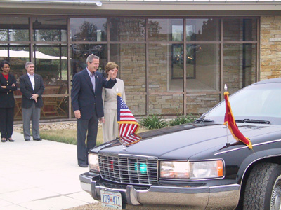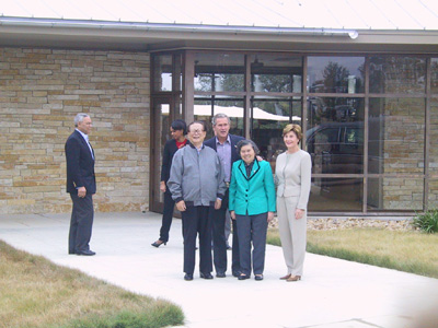 會(huì)談后,布什總統(tǒng)駕車(chē)陪同江主席夫婦參觀他的牧場(chǎng)。中午布什夫婦在家中設(shè)宴款待江澤民和夫人。
