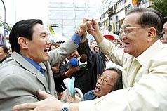 國民黨主席連戰(zhàn)(右)率黨內(nèi)重要干部為馬英九拉抬聲勢。“中央社”圖