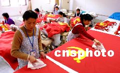 隨著黨的十六大的臨近,社會(huì)對(duì)黨旗的需求量也隨之大增,北京京工紅旗廠很多職工都放棄了雙休日加班趕制黨旗。蔡代征 攝