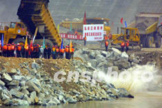 長(zhǎng)江三峽工程導(dǎo)流明渠截流,六日上午在國(guó)務(wù)院副總理吳邦國(guó)一聲令下開(kāi)始合龍。作者:宋吉河