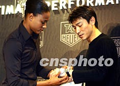 美國的“世界女飛人”瓊斯,11月7日在香港代表世界名表TAG Heuer公司向香港歌壇天王劉德華贈(zèng)送TAG Heuer Link C36自動(dòng)計(jì)時(shí)表。劉德華是全世界第二個(gè)獲得該款表的人士,第一個(gè)獲得者是世界高爾夫球王泰戈.伍茲。任晨鳴 攝