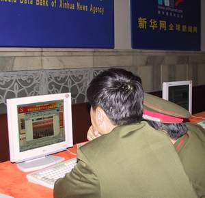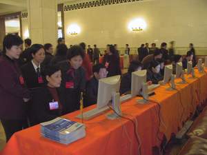 舉世矚目的中共十六大今天上午隆重揭幕,步入北京人民大會堂的代表們發(fā)現(xiàn),在人民大會堂東大廳南側(cè),新增了一排專線上網(wǎng)電腦。輕點(diǎn)鼠標(biāo),官方新華社所屬的新華網(wǎng)“中共十六大”實(shí)時報(bào)道網(wǎng)頁就出現(xiàn)在人們眼前。