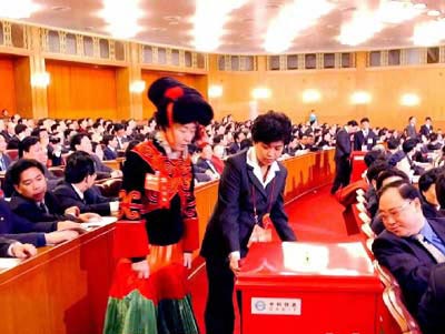 江澤民宣布進(jìn)行大會(huì)第一項(xiàng)議程——選舉中央委員會(huì)委員、候補(bǔ)委員和中央紀(jì)律檢查委員會(huì)委員后,工作人員開始發(fā)放選票。