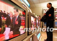 中共十六大十一月十四日在北京閉幕,市民在商場(chǎng)觀看胡錦濤投票的電視新聞。作者:張宇