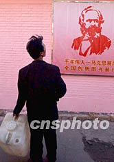北京的一名勞動(dòng)者被小街邊紅色馬克思畫像所吸引。日前閉幕的中共十六大宣布堅(jiān)持馬克思主義,這位大胡子的無(wú)產(chǎn)階級(jí)革命導(dǎo)師依然是世界最大政黨的偶像。作者:賈國(guó)榮