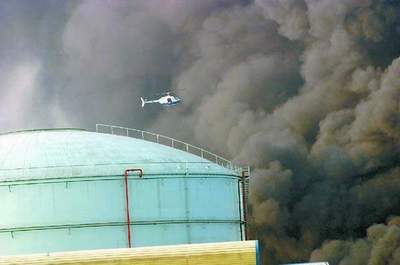 陳伯的兒子手指著火油船附近的一個(gè)頗大的黑色物體和區(qū)域內(nèi)的多座大型油罐告訴記者,那里是番禺番龍油庫,黑色物體是油船著火第二次爆炸時(shí)被炸飛的船殼。他說,當(dāng)時(shí)一聲巨響之后,只見船殼‘飛天’,高度達(dá)30多米,場(chǎng)景真是驚人。