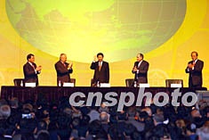 11月19日,第十六屆世界會計師大會在香港開幕,香港特首董建華(左二)、國際會計師聯(lián)合會會長雷尼·雷克爾(右二)等陪同中國國務(wù)院總理朱镕基出席。潘索菲 攝