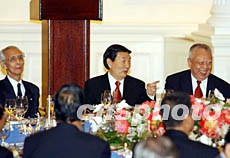 今晚的香港禮賓府華燈齊放,氣氛熱烈而溫馨。當朱镕基總理和夫人勞安在香港特區(qū)行政長官董建華和夫人董趙洪娉的陪同下步入宴會廳時,在場的香港各界人士報以熱烈的掌聲。朱镕基總理也微笑著鼓掌向大家致意。