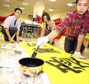 自救會工作人員趕制各式的布條、標(biāo)語。(民生報圖)