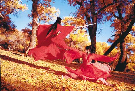 中新網(wǎng)11月27日電 張曼玉在電影《英雄》中除了跟梁朝偉于九寨溝瀑布前比劍外,還跟章子怡在內(nèi)蒙古一處遍地黃葉的胡楊林中比武。雖然誰勝誰負,要在電影中才有分曉,但單論畫面,意境就極之凄美。