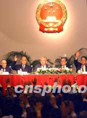 香港特區(qū)第十屆全國人民代表選舉第二次全體會議11月29日在香港召開,全國政協(xié)副主席霍英東、香港特首董建華、全國人大常委會秘書長何椿霖出席港區(qū)人大代表選舉會議,會議通過總監(jiān)票人及監(jiān)票人名單.中新社傳真 洪少葵 攝