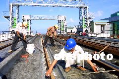 12月2日,隨著最后一根長(zhǎng)25米的特制鐵軌,成功鋪設(shè)在粵海鐵路南港棧橋橋面,全長(zhǎng)8738米的粵海鐵路南港棧橋鐵軌與?诨疖囌捐F軌接軌。至此,中國(guó)第一條跨海鐵路粵海鐵路南北港碼頭鐵路線全線貫通。圖為施工人員在南港棧橋上進(jìn)行測(cè)量和鋪軌工作。古月 攝