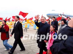 上午9:10時(shí),國務(wù)院副總理、中國申博代表團(tuán)團(tuán)長李嵐清和夫人,中共中央政治局委員、國務(wù)委員、國家申博委主任吳儀,中共中央政治局委員、上海市委書記、上海市市長、國家申博委副主任陳良宇等步下舷梯,接受了四名少先隊(duì)員代表獻(xiàn)上的鮮花。上海市市領(lǐng)導(dǎo)到機(jī)場迎接。