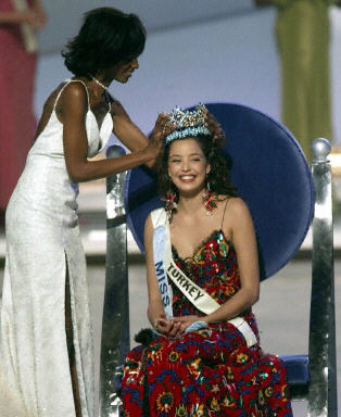 摘取2002年“世界小姐”桂冠的土耳其小姐阿茲拉·阿金(中)和獲亞軍的哥倫比亞小姐納塔利亞·佩拉爾塔(左)、獲季軍的秘魯小姐瑪麗娜·莫拉·蒙特羅(右)合影。