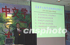 全美中文學(xué)校協(xié)會(huì)第四次全國(guó)代表大會(huì)十二月七日在芝加哥舉行,該會(huì)會(huì)員學(xué)校遍及美國(guó)四十一個(gè)州,學(xué)生五萬(wàn)多名。圖為會(huì)長(zhǎng)鄭良根在開幕式上以《美國(guó)中文教育在新世紀(jì)里騰飛》為題作工作報(bào)告,介紹協(xié)會(huì)工作情況和華文教育在美國(guó)的迅速發(fā)展。作者:趙海燕
