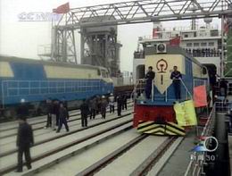 粵海鐵路此次重載聯(lián)調(diào)試驗是從12月11號開始的,首先在瓊州海峽北岸的北港碼頭進(jìn)行了重載列車的裝船和卸船試驗,取得了圓滿成功。昨天開始,粵海鐵一號火車渡輪裝載著兩列總重超過700噸的鋼軌專列和兩臺重達(dá)138噸的機(jī)車正式開始跨海航行試驗,經(jīng)過44分鐘的航行,順利抵達(dá)南港碼頭。