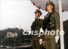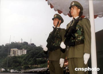 中國人民解放軍駐澳門部隊(duì)在古老的松山燈塔下站崗。作者:中新社
