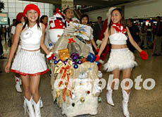 十二月二十日,香港機(jī)場購物廊圣誕慶;顒咏议_序幕,圖為身穿美麗服裝的女孩們將圣誕禮品派發(fā)給旅客。潘索菲 攝