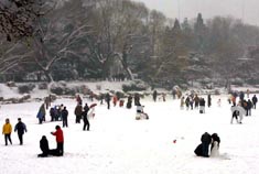 上午11點(diǎn),陶然亭公園潔白的湖面成了公園人氣最旺的地方。人們在冰面上滾雪球、堆雪人、打雪仗、滑冰車。走在公園的小路上,你會(huì)跟許多形狀滑稽的雪人不期而遇,它們相貌各異,有的頭插一串鮮花,有的脖子系著五彩繽紛的布條,有的頭頂一片綠色柏樹枝。一群中學(xué)生玩雪的創(chuàng)意更是獨(dú)特:將數(shù)十個(gè)拳頭大的雪球串在一棵桃樹的樹枝上,遠(yuǎn)遠(yuǎn)望去,仿佛滿樹盛開著鮮花。