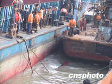 長(zhǎng)壽特大海損事故沉船打撈工作目前已進(jìn)行三天,今天下午四點(diǎn)五十六分,沉船船頭已露出水面。十八日上午七時(shí)二十分左右,長(zhǎng)江重慶長(zhǎng)壽水域發(fā)生特大海損事故,載有三十輛汽車的滾裝船宜盛號(hào)與一過江客運(yùn)輪渡相撞,造成八人死亡,三十二人失蹤。圖為打撈出水面的沉船船頭。雷鳴攝