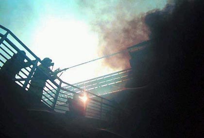 10時09分,指揮部根據(jù)前沿指揮員報告現(xiàn)場偵檢情況,不明氣體屬于有毒腐蝕性不強的氨氣。為避免不必要的傷害,指揮部采取強大的噴霧水流措施驅散氣體,加強外圍警戒;10點20分,車道內(nèi)的氣體驅散完畢,指揮部一聲令下發(fā)起總攻,數(shù)百條水龍一齊噴射。
