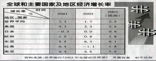 世行高級副行長首席經(jīng)濟學(xué)家斯特恩在接受光明日報記者專訪時,對世界經(jīng)濟今年的特點進行了具體分析。斯特恩說,“今年世界經(jīng)濟增長率比人們年初的預(yù)期要低0.25%。世界經(jīng)濟今年的一大特點是美國、日本和歐元區(qū)的經(jīng)濟增長同步放慢。具體分析起來,他們衰退的原因既有相似的地方,也有不同之處。”