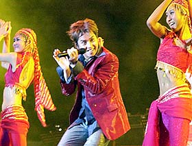 只見阿倫一身金色的服裝,再次出現(xiàn)在觀眾面前。而歌迷也開始離席,跑到觀眾席的最前排,不一會(huì)兒,整百位歌迷就在臺(tái)前隨著音樂起舞。