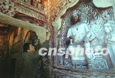 包括大同云崗石窟在內(nèi)的中國(guó)二十八處世界自然、文化遺產(chǎn)復(fù)制品歲末將在北京集中展出,以紀(jì)念《世界遺產(chǎn)公約》簽訂三十周年。圖為工作人員在云崗石窟展區(qū)作最后的布置。作者:張勤