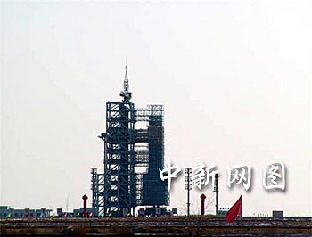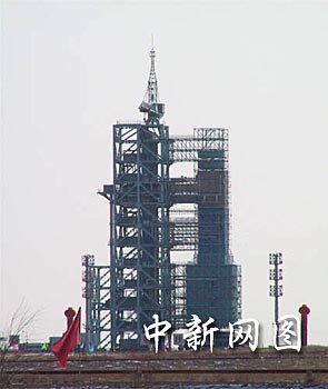 組圖:“神舟”四號(hào)飛船發(fā)射前倚立于發(fā)射塔旁