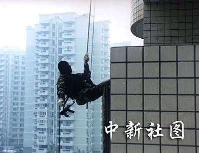 26日,成都首次反恐怖演習。在處置恐怖分子對某跨國公司辦公大樓實施的劫持人質的演習中,特警秘密潛入大樓,準備伺機行動。作者:劉真