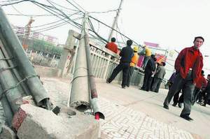 中新網(wǎng)1月3日電 昨天凌晨5時(shí)許,一輛加長(zhǎng)貨車路過廣州市廣園西路王圣堂與京廣鐵路交匯處時(shí),不慎掛上空中鋪設(shè)的民用電纜,拉斷四根用于架設(shè)電纜的水泥桿,導(dǎo)致近300米電纜垂落在地。因搶修該電纜造成京廣線廣州段中斷一個(gè)多小時(shí),其中有一段電纜險(xiǎn)些碰上京廣鐵路2.7萬伏鐵路專用高壓電網(wǎng)。